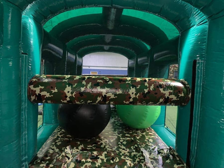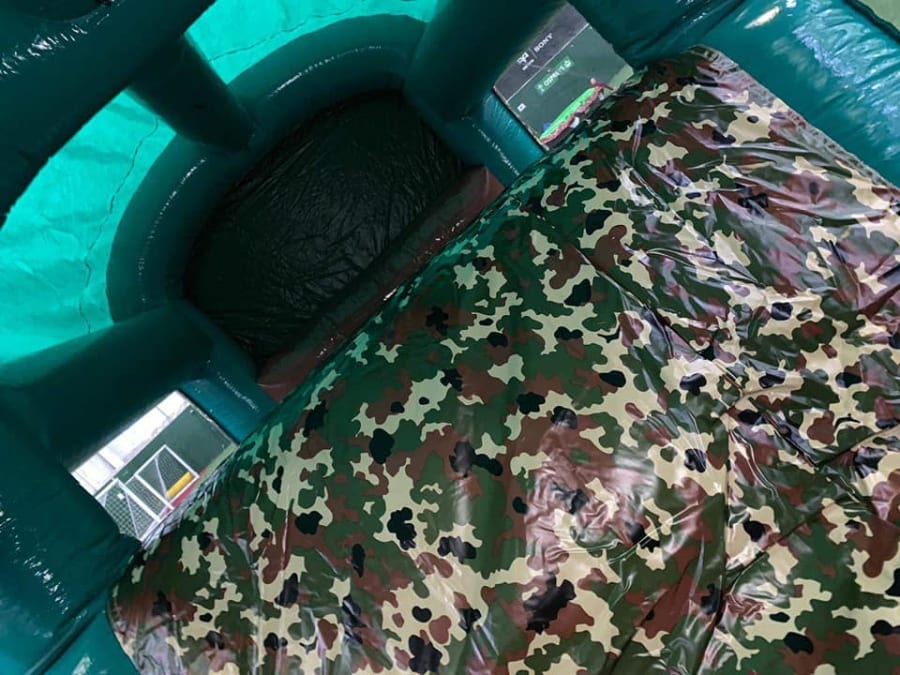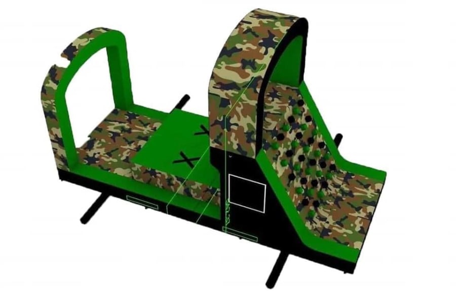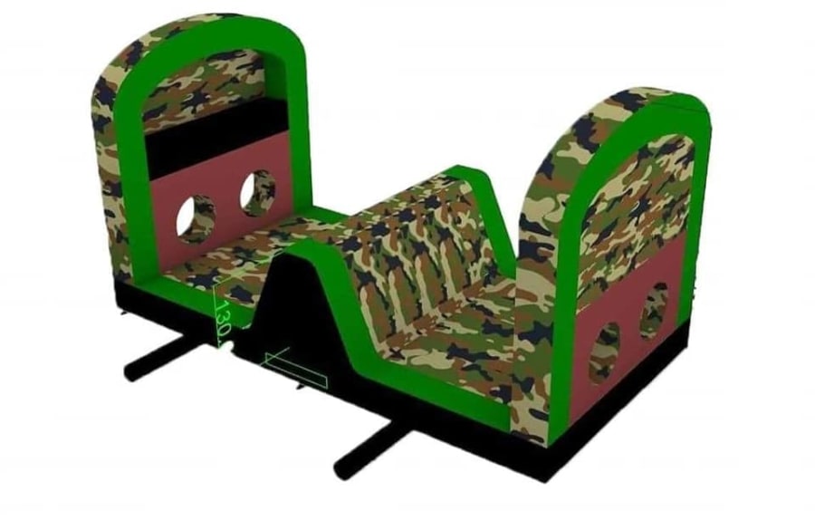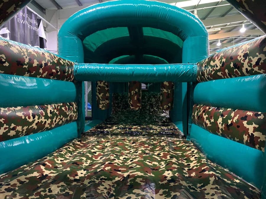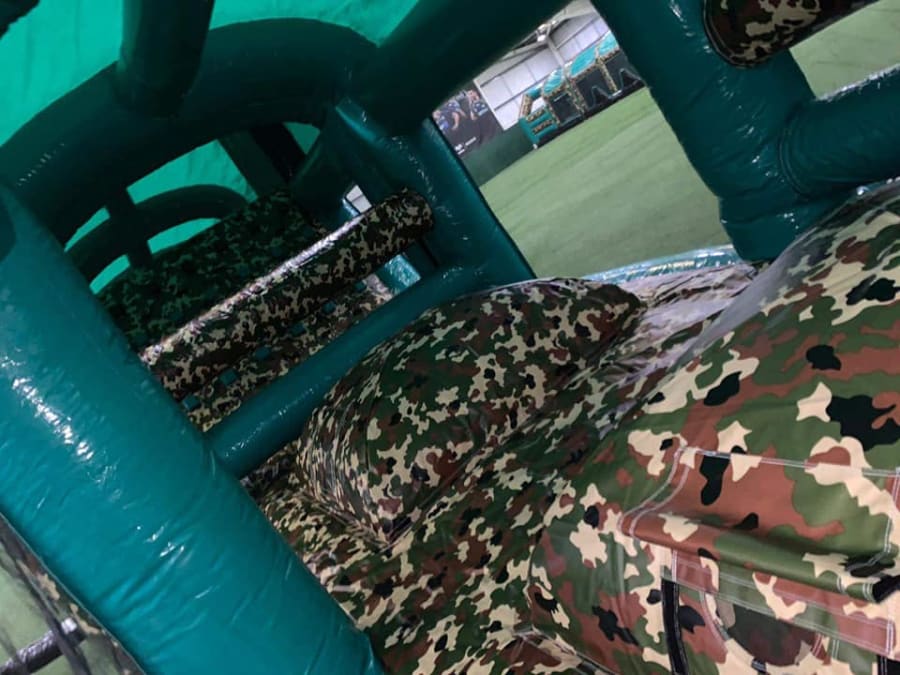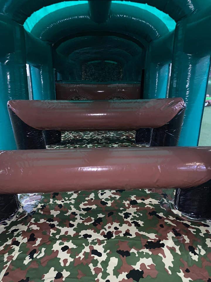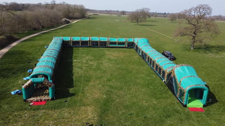 This is the Behomoth! We do not know of any other assault course available to hire privately this big, with so many obstacles and so flexible. It's a huge 420 foot in total length! However, it's made of sections and is modular, so not only can we change the order and make the inflatable a different experience each time, but we can also make it different shapes, too! It has corner pieces so that by default we configure it into a Horse-shoe shape, returning back on itself. However, we can make it one long giant assault course and change the shape if it to suit the space available, making sections longer or shorter! This has been custom made and is a unique one-off inflatable exclusively available to our customers. You will not find another army boot camp styled assault course like this one anywhere else in the world! It's a fun course that takes 8 minutes to complete at a casual pace taking your time, but we have seen people race through it in half that time when competing head to head! It saps your energy and drains you as you go round. The obstacles aren't your standard inflatable bish-bash, the course boasts some of the most complex and realistic army challenges ever seen on an inflatable! It has crawl areas (totally safe and not enclosed), parts you need to jump over and duck through, it has army-styled foot drills to hop through, hanging balls, balance areas, tank-buster tracks, air-mountains to climb, a base jump, big slide at the end, climbing walls, port-holes, boulders to over-come and more! It's an incredible experience and really not something you can compare to any other usual or standard assault course. This is a fantastic opportunity for corporate fun-days and excellent for team building exercises across the country. We are able to set the equipment up inside extremely large venues but also supply power ourselves for outside events, bringing our own generators and safety equipment. We believe that this is the biggest assault course available to privately hire in the UK, you wont find anything like this anywhere else! This can of course be hired for private parties, school events, fetes, fun-fairs and other community events, but being the biggest army assault course the UK has to offer, it does mean that we have to charge a premium. We deliver it in three large vans and it takes several staff to set the equipment up, taking 2-3 hours to set-up (depending on access and site) and the same again to pack it away. It's the perfect choice for progressive corporate companies to book for their employee and family fun-days, for product launches, company openings and any time you are looking to make a big splash and grab attention, or just provide an incredible experience for employees on team building days! Being the biggest assault course of this style available to hire, it has an incredibly large capacity and has an official load of 75 adults or children at any one time! We can shape this inflatables so that there is a big wide open-space in the middle, forming a square area that you can host the rest of your fun-day inside, making the assault course the perimeter wall of the entire event, wrapping all the way round! We can also provide rodeo-bulls, huge slides and another unique base jump inflatable that is the biggest of it's kind in the UK! We are based in Swindon, but deliver this inflatable all over the country and can quote for delivery anywhere in the UK except Northern Ireland due to transportation costs. We appreciate that a booking like this one requires some forward planning and communication. We are very happy to answer any questions you might have and discuss the logistics before any commitment is made and encourage you to Contact Us if you would like to hire this!