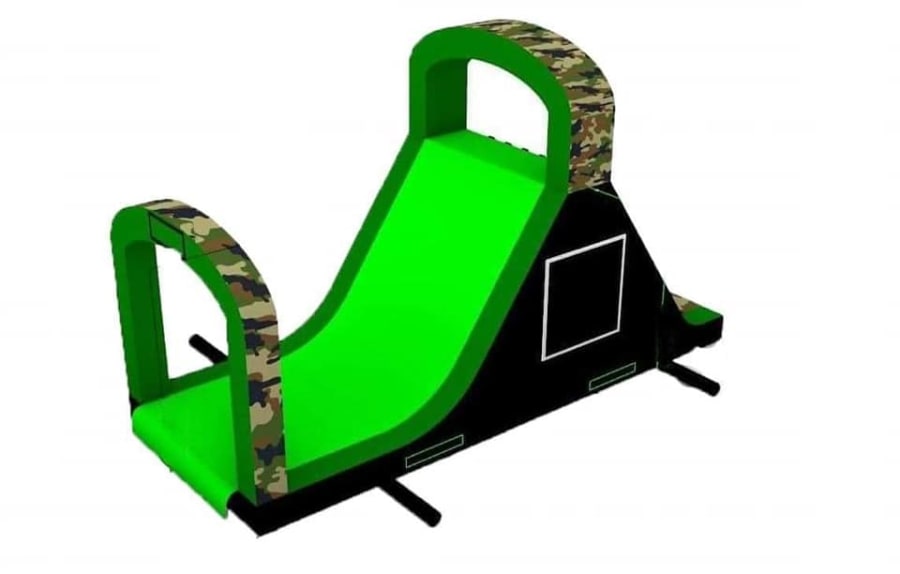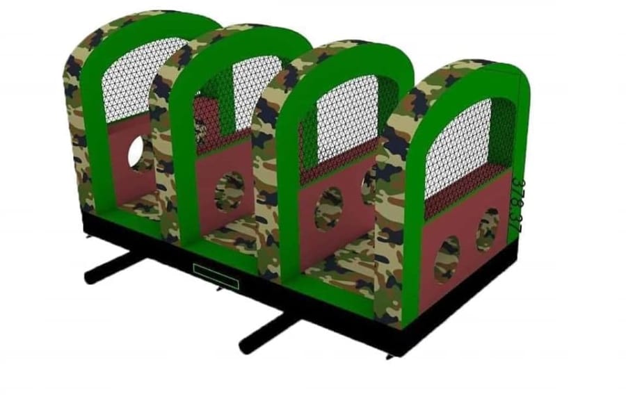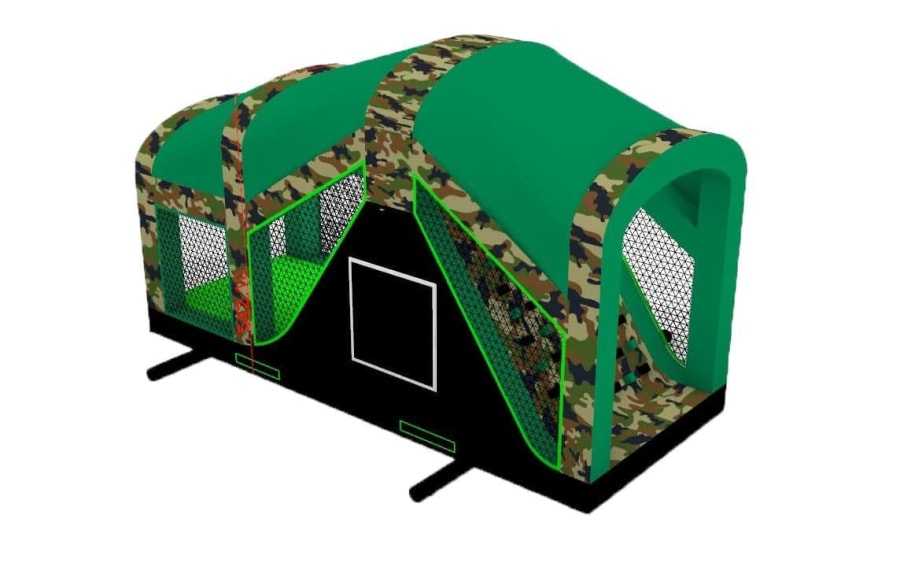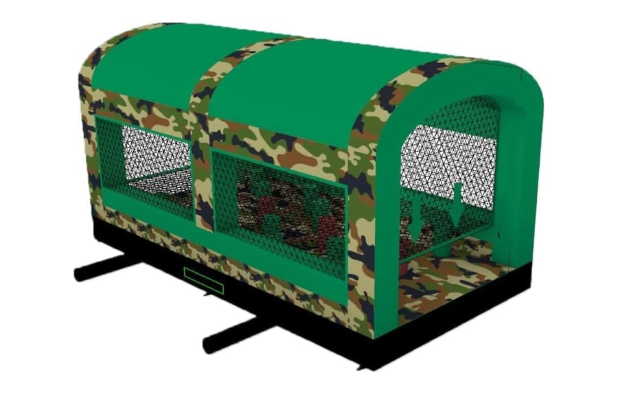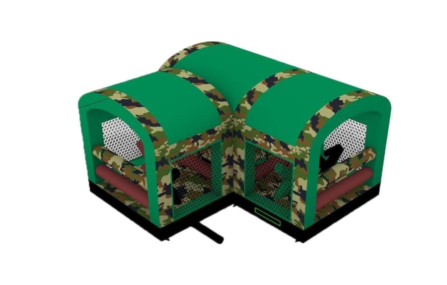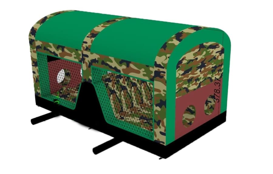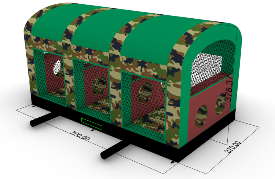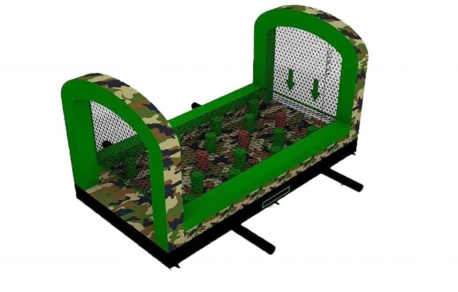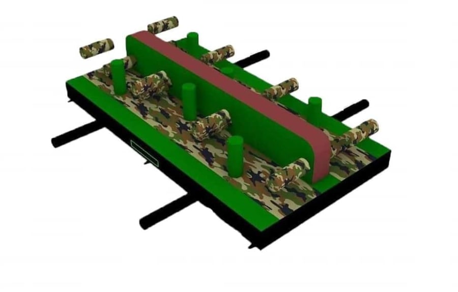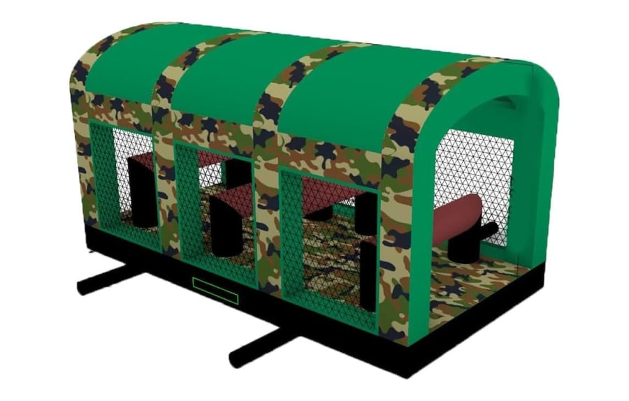 This is the Behomoth! We do not know of any other assault course available to hire privately this big, with so many obstacles and so flexible. It's a huge 420 foot in total length! However, it's made of sections and is modular, so not only can we change the order and make the inflatable a different experience each time, but we can also make it different shapes, too! It has corner pieces so that by default we configure it into a Horse-shoe shape, returning back on itself. However, we can make it one long giant assault course and change the shape if it to suit the space available, making sections longer or shorter! This has been custom made and is a unique one-off inflatable exclusively available to our customers. You will not find another army boot camp styled assault course like this one anywhere else in the world! It's a fun course that takes 8 minutes to complete at a casual pace taking your time, but we have seen people race through it in half that time when competing head to head! It saps your energy and drains you as you go round. The obstacles aren't your standard inflatable bish-bash, the course boasts some of the most complex and realistic army challenges ever seen on an inflatable! It has crawl areas (totally safe and not enclosed), parts you need to jump over and duck through, it has army-styled foot drills to hop through, hanging balls, balance areas, tank-buster tracks, air-mountains to climb, a base jump, big slide at the end, climbing walls, port-holes, boulders to over-come and more! It's an incredible experience and really not something you can compare to any other usual or standard assault course. This is a fantastic opportunity for corporate fun-days and excellent for team building exercises across the country. We are able to set the equipment up inside extremely large venues but also supply power ourselves for outside events, bringing our own generators and safety equipment. We believe that this is the biggest assault course available to privately hire in the UK, you wont find anything like this anywhere else! This can of course be hired for private parties, school events, fetes, fun-fairs and other community events, but being the biggest army assault course the UK has to offer, it does mean that we have to charge a premium. We deliver it in three large vans and it takes several staff to set the equipment up, taking 2-3 hours to set-up (depending on access and site) and the same again to pack it away. It's the perfect choice for progressive corporate companies to book for their employee and family fun-days, for product launches, company openings and any time you are looking to make a big splash and grab attention, or just provide an incredible experience for employees on team building days! Being the biggest assault course of this style available to hire, it has an incredibly large capacity and has an official load of 75 adults or children at any one time! We can shape this inflatables so that there is a big wide open-space in the middle, forming a square area that you can host the rest of your fun-day inside, making the assault course the perimeter wall of the entire event, wrapping all the way round! We can also provide rodeo-bulls, huge slides and another unique base jump inflatable that is the biggest of it's kind in the UK! We are based in Swindon, but deliver this inflatable all over the country and can quote for delivery anywhere in the UK except Northern Ireland due to transportation costs. We appreciate that a booking like this one requires some forward planning and communication. We are very happy to answer any questions you might have and discuss the logistics before any commitment is made and encourage you to Contact Us if you would like to hire this!