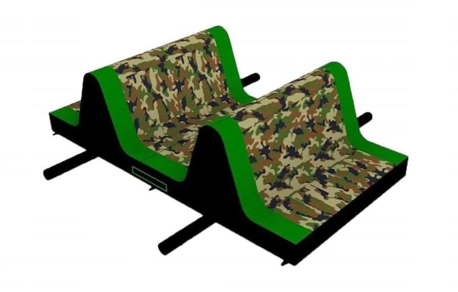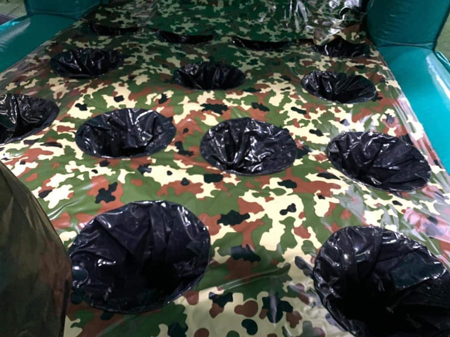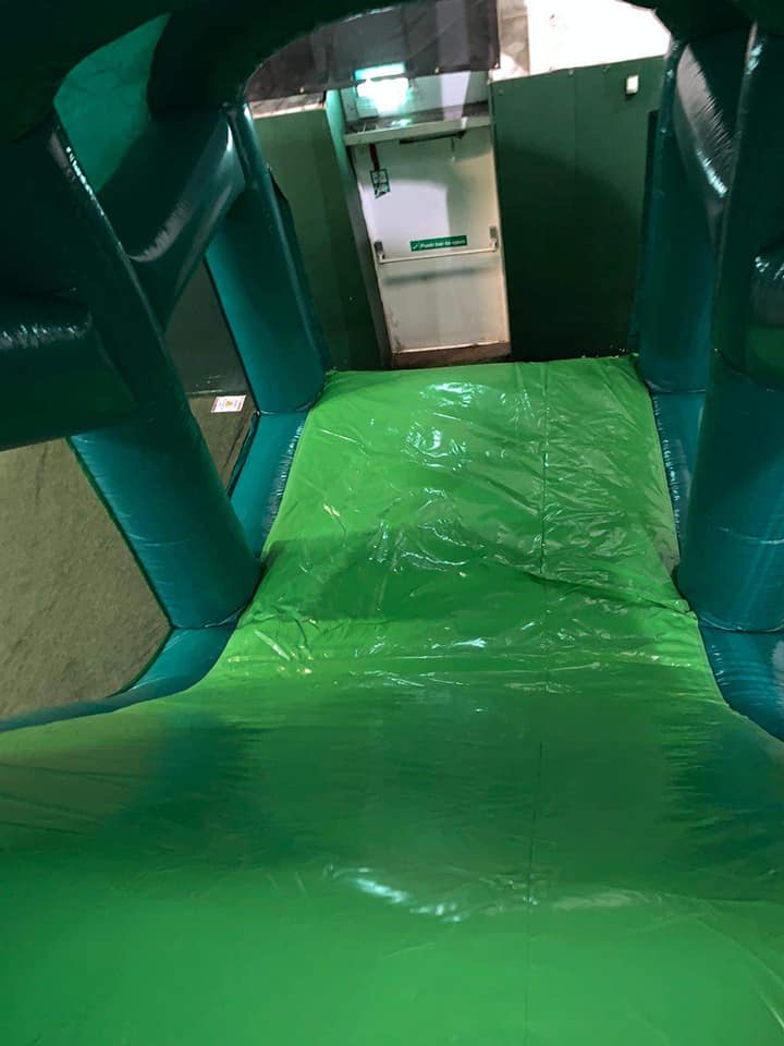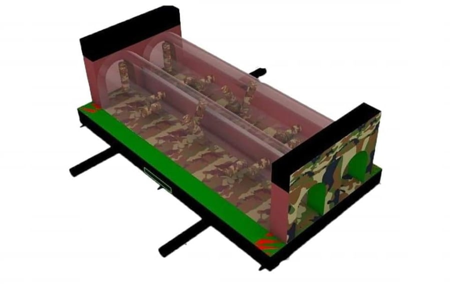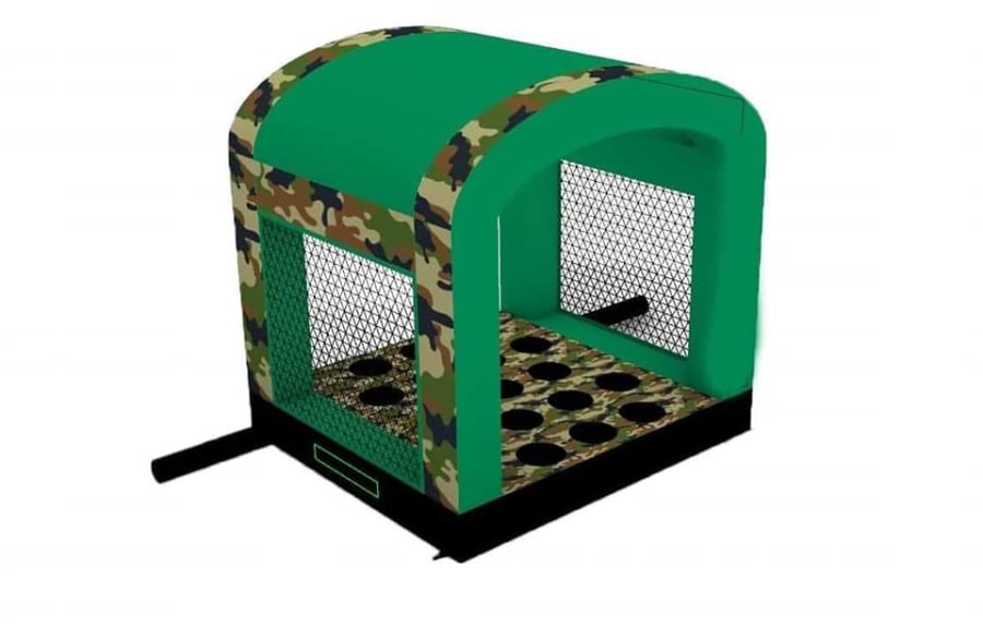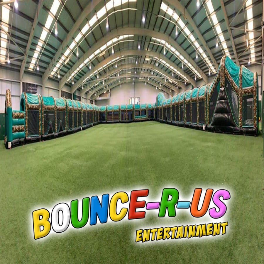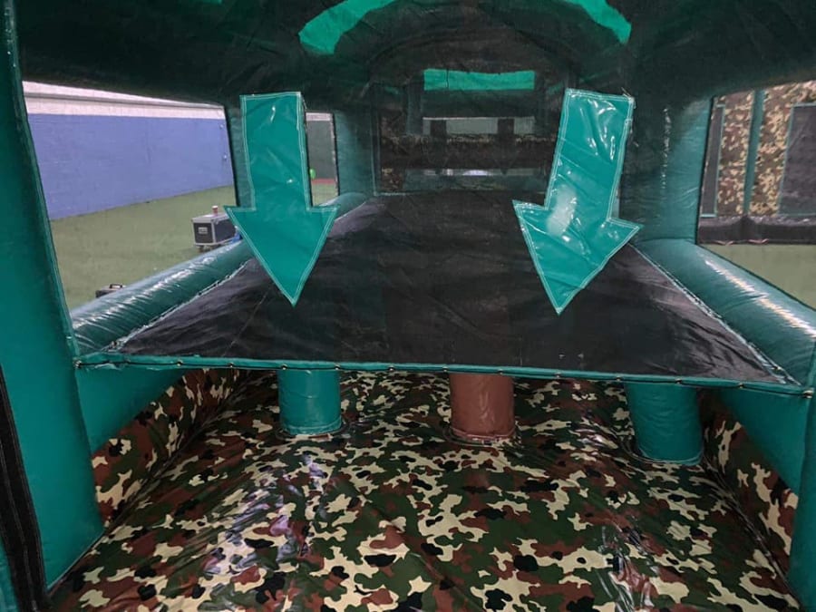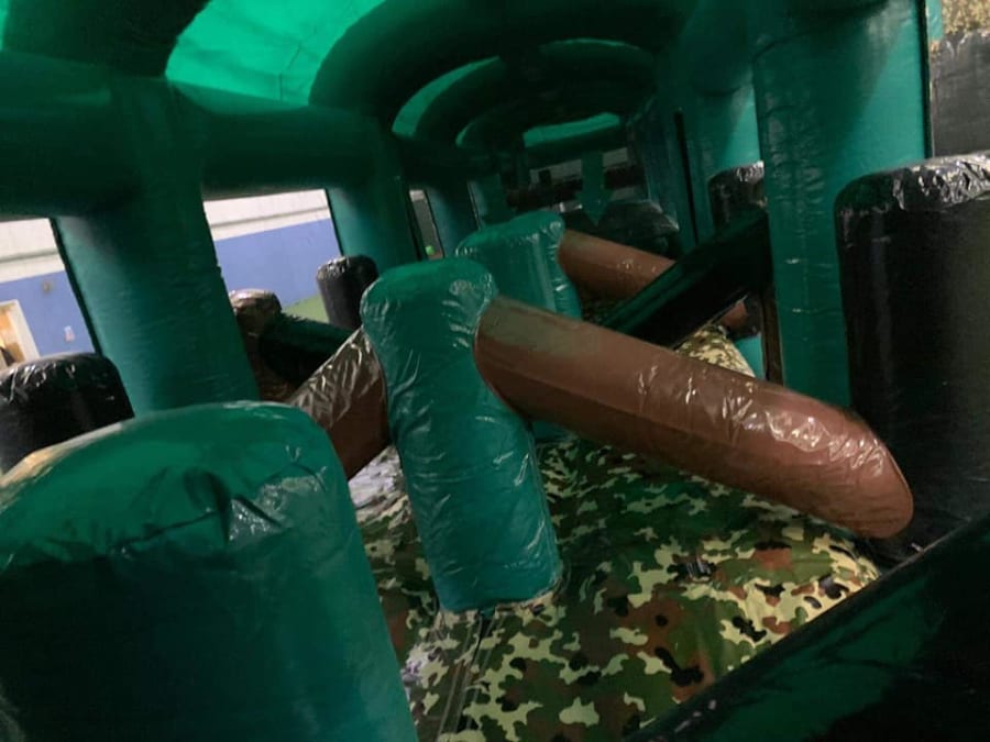 This is the Behomoth! We do not know of any other assault course available to hire privately this big, with so many obstacles and so flexible. It's a huge 420 foot in total length! However, it's made of sections and is modular, so not only can we change the order and make the inflatable a different experience each time, but we can also make it different shapes, too! It has corner pieces so that by default we configure it into a Horse-shoe shape, returning back on itself. However, we can make it one long giant assault course and change the shape if it to suit the space available, making sections longer or shorter! This has been custom made and is a unique one-off inflatable exclusively available to our customers. You will not find another army boot camp styled assault course like this one anywhere else in the world! It's a fun course that takes 8 minutes to complete at a casual pace taking your time, but we have seen people race through it in half that time when competing head to head! It saps your energy and drains you as you go round. The obstacles aren't your standard inflatable bish-bash, the course boasts some of the most complex and realistic army challenges ever seen on an inflatable! It has crawl areas (totally safe and not enclosed), parts you need to jump over and duck through, it has army-styled foot drills to hop through, hanging balls, balance areas, tank-buster tracks, air-mountains to climb, a base jump, big slide at the end, climbing walls, port-holes, boulders to over-come and more! It's an incredible experience and really not something you can compare to any other usual or standard assault course. This is a fantastic opportunity for corporate fun-days and excellent for team building exercises across the country. We are able to set the equipment up inside extremely large venues but also supply power ourselves for outside events, bringing our own generators and safety equipment. We believe that this is the biggest assault course available to privately hire in the UK, you wont find anything like this anywhere else! This can of course be hired for private parties, school events, fetes, fun-fairs and other community events, but being the biggest army assault course the UK has to offer, it does mean that we have to charge a premium. We deliver it in three large vans and it takes several staff to set the equipment up, taking 2-3 hours to set-up (depending on access and site) and the same again to pack it away. It's the perfect choice for progressive corporate companies to book for their employee and family fun-days, for product launches, company openings and any time you are looking to make a big splash and grab attention, or just provide an incredible experience for employees on team building days! Being the biggest assault course of this style available to hire, it has an incredibly large capacity and has an official load of 75 adults or children at any one time! We can shape this inflatables so that there is a big wide open-space in the middle, forming a square area that you can host the rest of your fun-day inside, making the assault course the perimeter wall of the entire event, wrapping all the way round! We can also provide rodeo-bulls, huge slides and another unique base jump inflatable that is the biggest of it's kind in the UK! We are based in Swindon, but deliver this inflatable all over the country and can quote for delivery anywhere in the UK except Northern Ireland due to transportation costs. We appreciate that a booking like this one requires some forward planning and communication. We are very happy to answer any questions you might have and discuss the logistics before any commitment is made and encourage you to Contact Us if you would like to hire this!