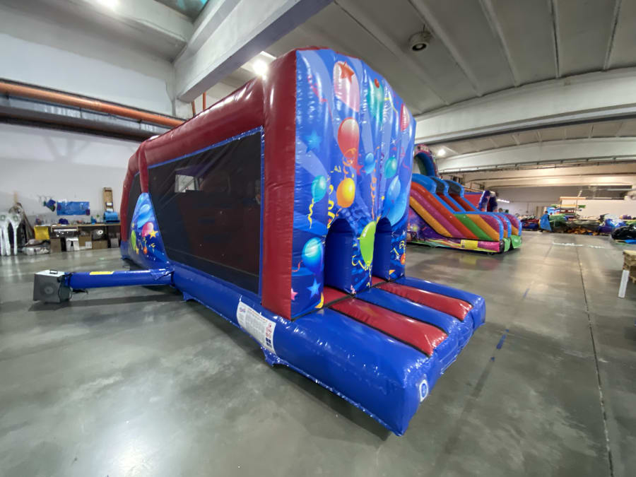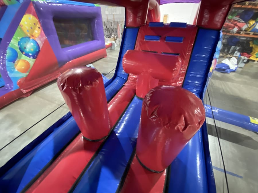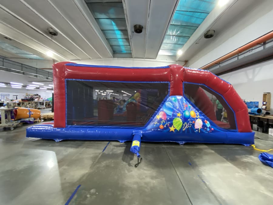 This Partytime fun run is a mini assault course ready for the kids to have loads of fun. Single piece where the kids dive through the start holes into the bounce bed where there is some pop ups to run through along to the steps that go up too the slide ready for them to sit down legs first to slide down. Then they make their way back to the front to start all over again.